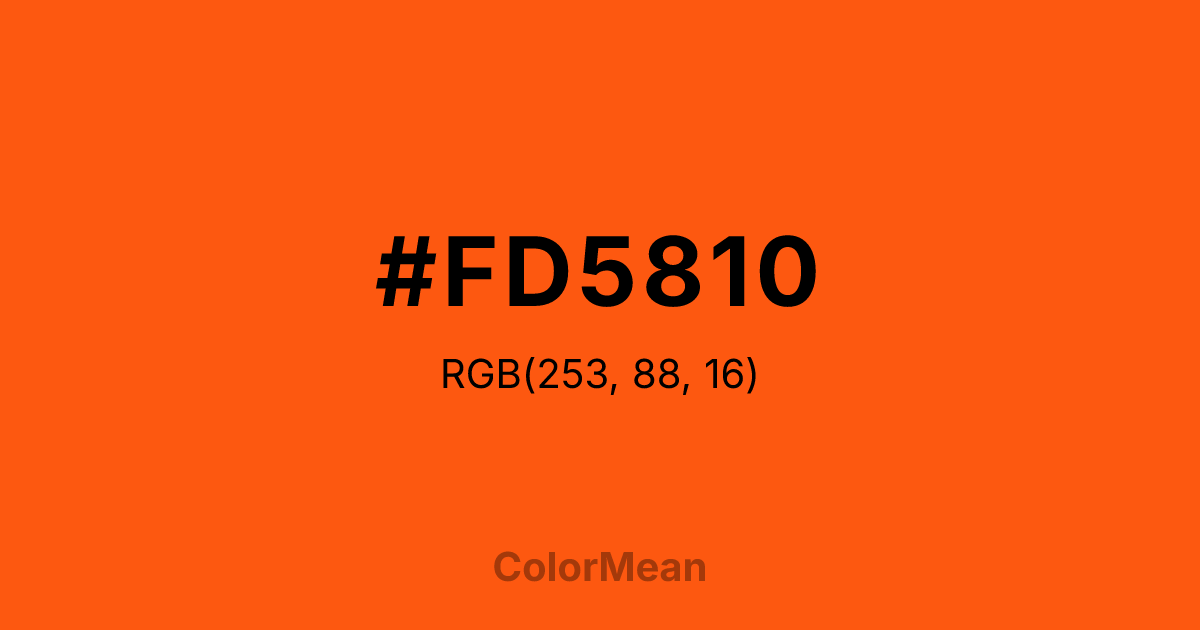 #FD5810 RGB value is (253, 88, 16). The hex color red value is 253, green is 88, and blue is 16. Its HSL format shows a hue of 18°, saturation of 98 percent, and lightness of 53 percent. The CMYK process values are 0 percent, 65 percent, 94 percent, 1 percent.