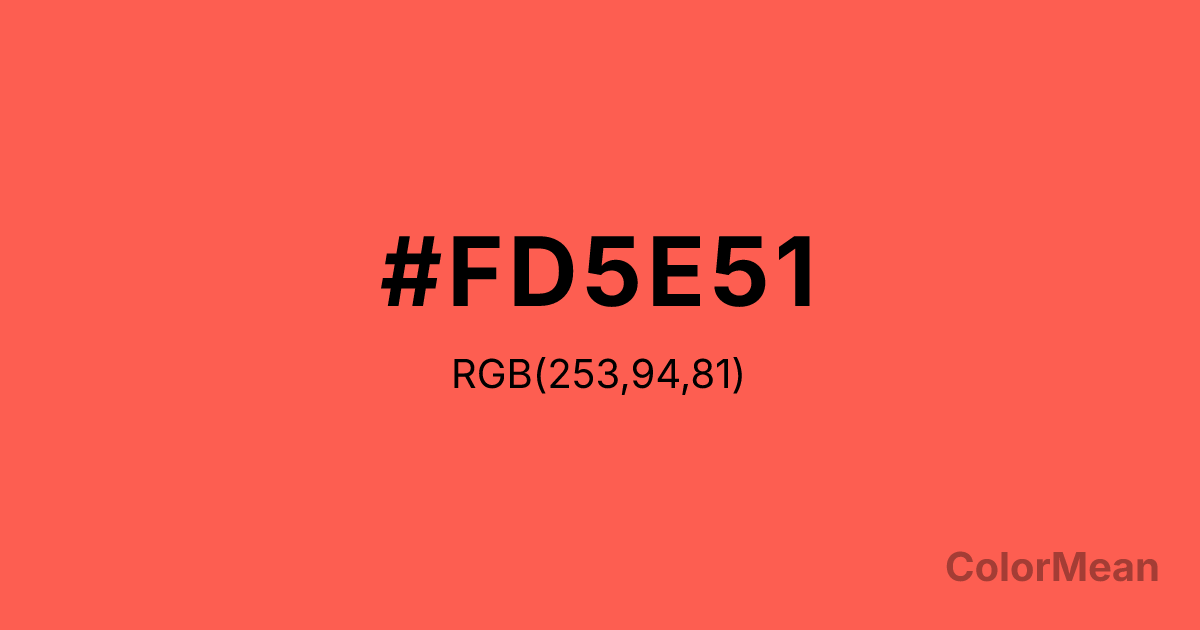 #FD5E51 RGB value is (253, 94, 81). The hex color red value is 253, green is 94, and blue is 81. Its HSL format shows a hue of 5°, saturation of 98 percent, and lightness of 65 percent. The CMYK process values are 0 percent, 63 percent, 68 percent, 1 percent.
