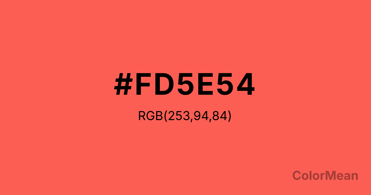 #FD5E54 RGB value is (253, 94, 84). The hex color red value is 253, green is 94, and blue is 84. Its HSL format shows a hue of 4°, saturation of 98 percent, and lightness of 66 percent. The CMYK process values are 0 percent, 63 percent, 67 percent, 1 percent.