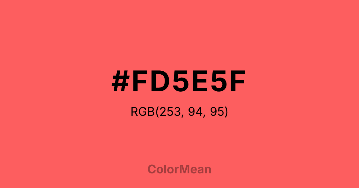#FD5E5F RGB value is (253, 94, 95). The hex color red value is 253, green is 94, and blue is 95. Its HSL format shows a hue of 360°, saturation of 98 percent, and lightness of 68 percent. The CMYK process values are 0 percent, 63 percent, 62 percent, 1 percent.