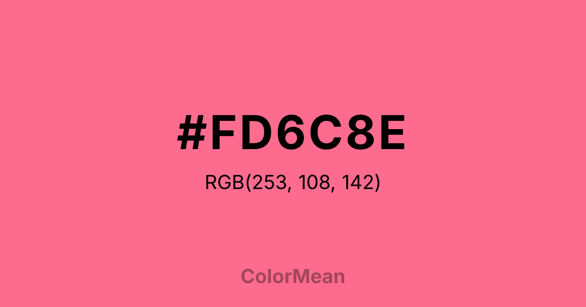 #FD6C8E RGB value is (253, 108, 142). The hex color red value is 253, green is 108, and blue is 142. Its HSL format shows a hue of 346°, saturation of 97 percent, and lightness of 71 percent. The CMYK process values are 0 percent, 57 percent, 44 percent, 1 percent.