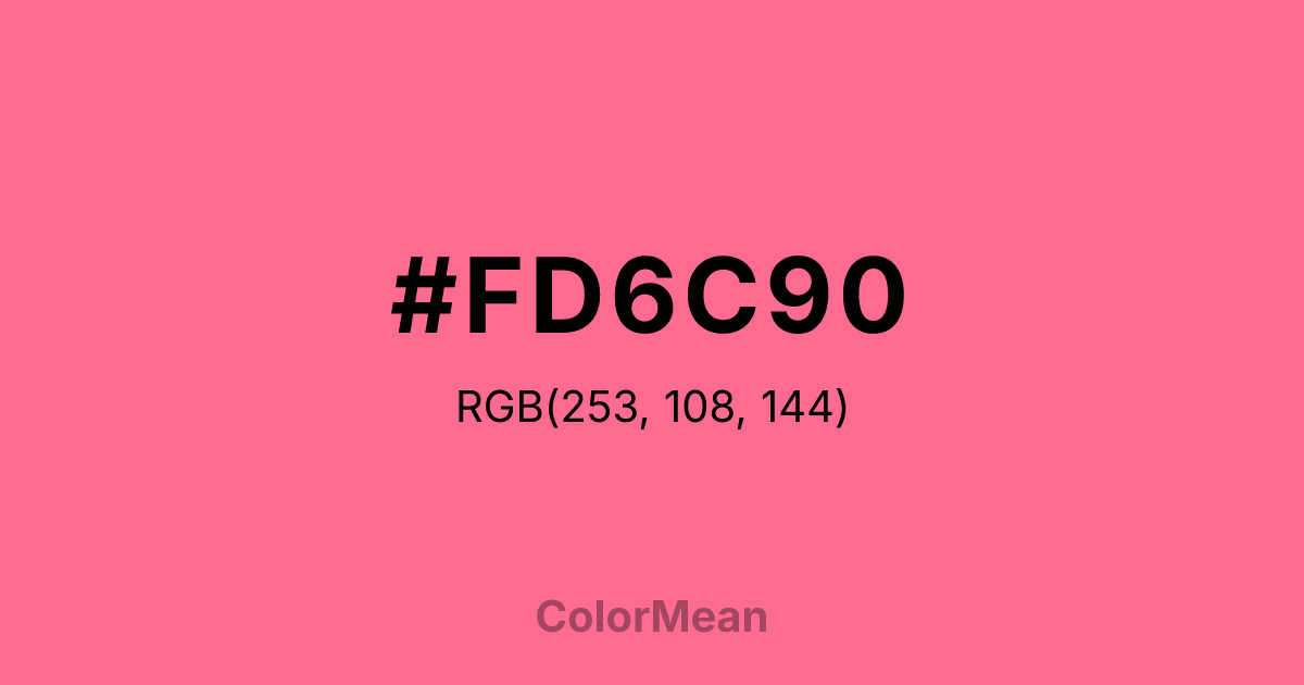 #FD6C90 RGB value is (253, 108, 144). The hex color red value is 253, green is 108, and blue is 144. Its HSL format shows a hue of 345°, saturation of 97 percent, and lightness of 71 percent. The CMYK process values are 0 percent, 57 percent, 43 percent, 1 percent.