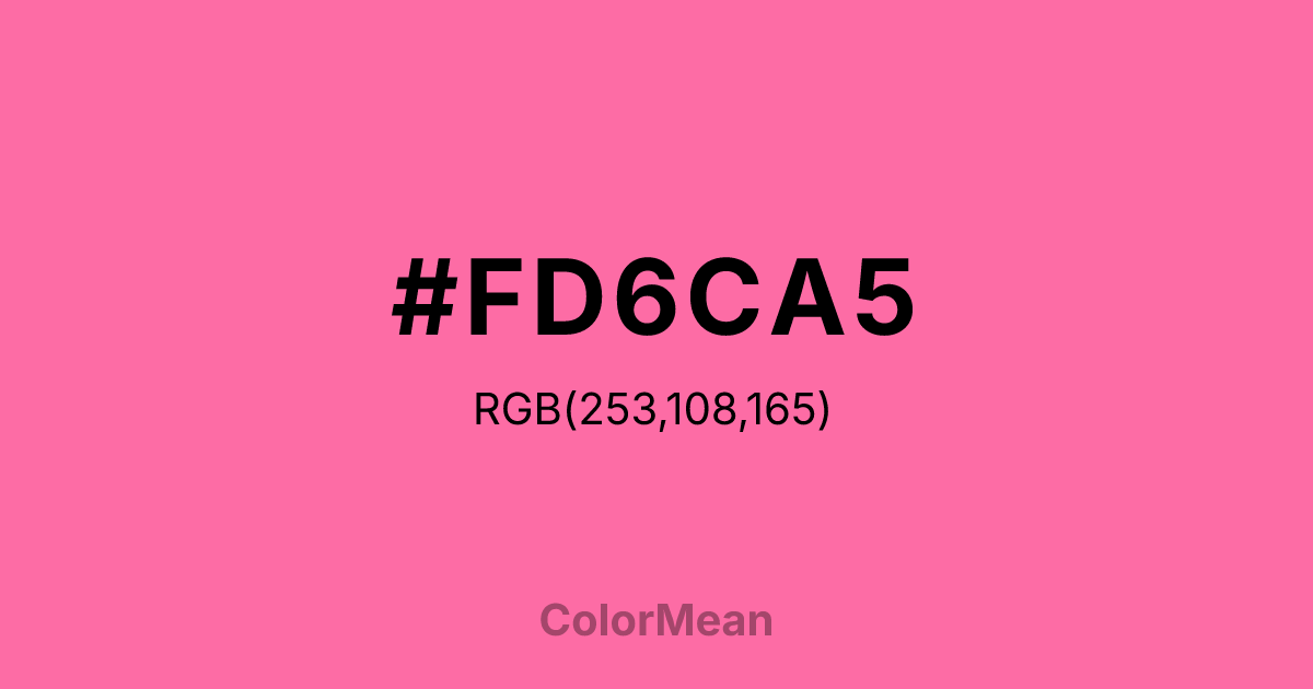 #FD6CA5 RGB value is (253, 108, 165). The hex color red value is 253, green is 108, and blue is 165. Its HSL format shows a hue of 336°, saturation of 97 percent, and lightness of 71 percent. The CMYK process values are 0 percent, 57 percent, 35 percent, 1 percent.