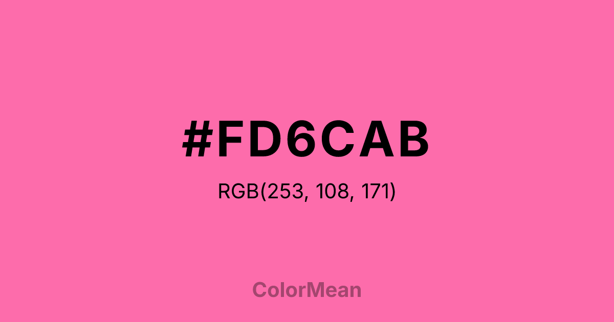 #FD6CAB RGB value is (253, 108, 171). The hex color red value is 253, green is 108, and blue is 171. Its HSL format shows a hue of 334°, saturation of 97 percent, and lightness of 71 percent. The CMYK process values are 0 percent, 57 percent, 32 percent, 1 percent.