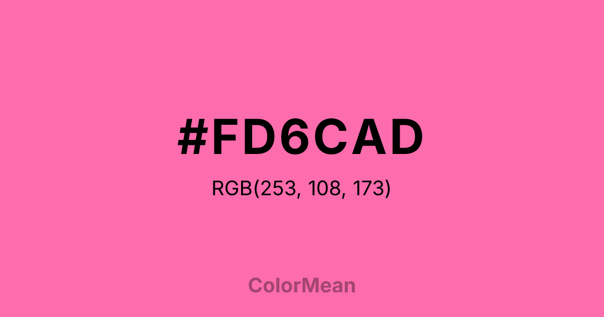 #FD6CAD RGB value is (253, 108, 173). The hex color red value is 253, green is 108, and blue is 173. Its HSL format shows a hue of 333°, saturation of 97 percent, and lightness of 71 percent. The CMYK process values are 0 percent, 57 percent, 32 percent, 1 percent.
