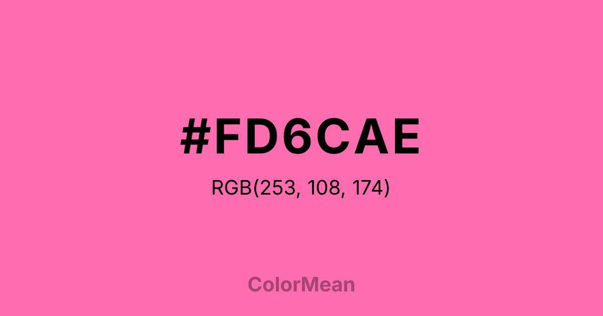 #FD6CAE RGB value is (253, 108, 174). The hex color red value is 253, green is 108, and blue is 174. Its HSL format shows a hue of 333°, saturation of 97 percent, and lightness of 71 percent. The CMYK process values are 0 percent, 57 percent, 31 percent, 1 percent.