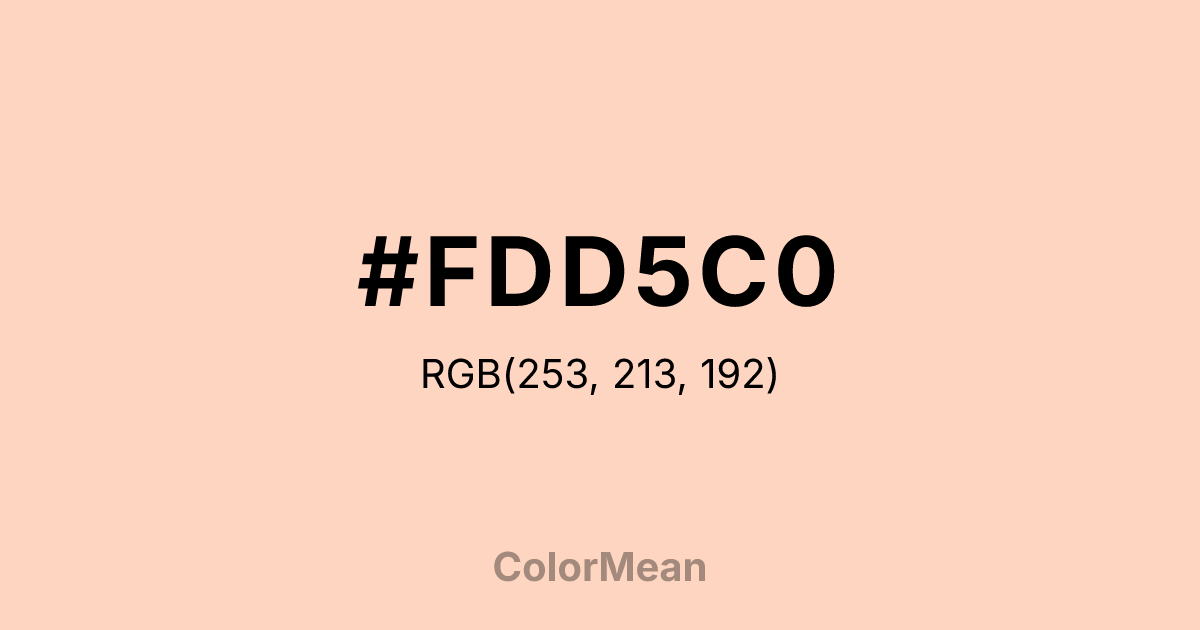 #FDD5C0 RGB value is (253, 213, 192). The hex color red value is 253, green is 213, and blue is 192. Its HSL format shows a hue of 21°, saturation of 94 percent, and lightness of 87 percent. The CMYK process values are 0 percent, 16 percent, 24 percent, 1 percent.