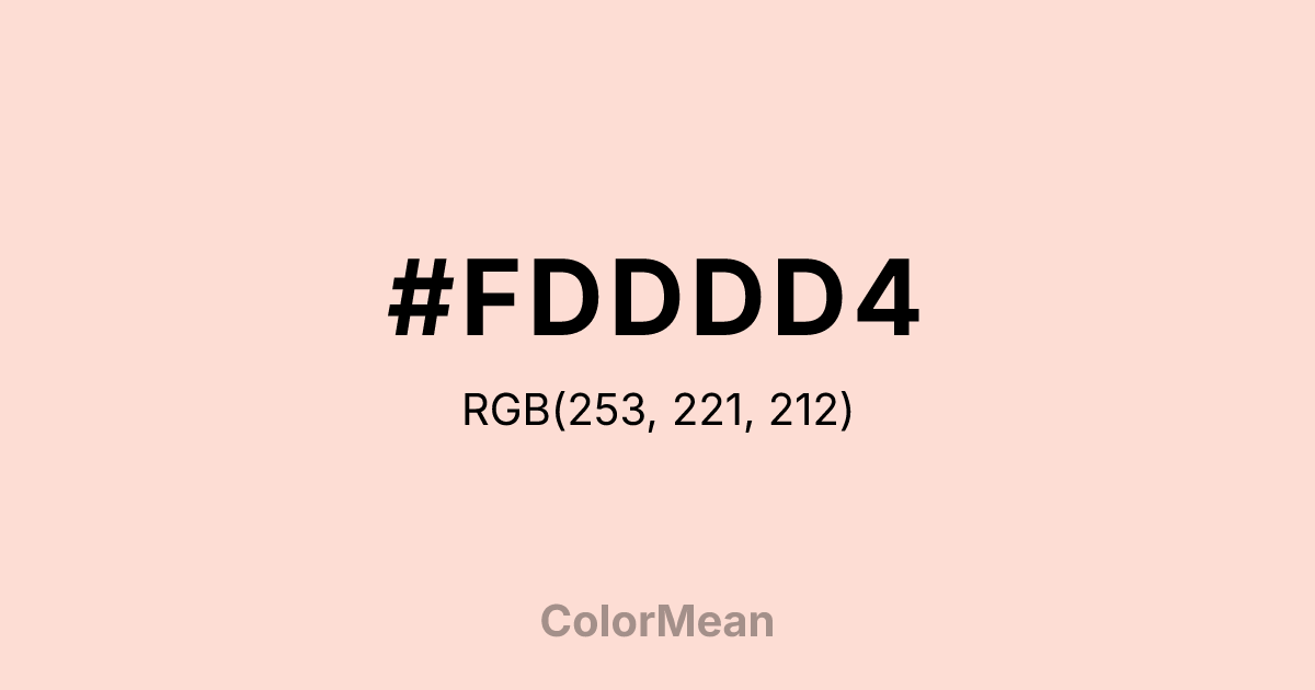 #FDDDD4 RGB value is (253, 221, 212). The hex color red value is 253, green is 221, and blue is 212. Its HSL format shows a hue of 13°, saturation of 91 percent, and lightness of 91 percent. The CMYK process values are 0 percent, 13 percent, 16 percent, 1 percent.