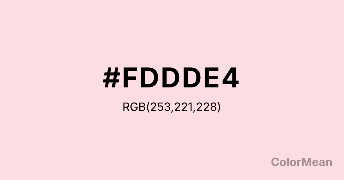 #FDDDE4 RGB value is (253, 221, 228). The hex color red value is 253, green is 221, and blue is 228. Its HSL format shows a hue of 347°, saturation of 89 percent, and lightness of 93 percent. The CMYK process values are 0 percent, 13 percent, 10 percent, 1 percent.