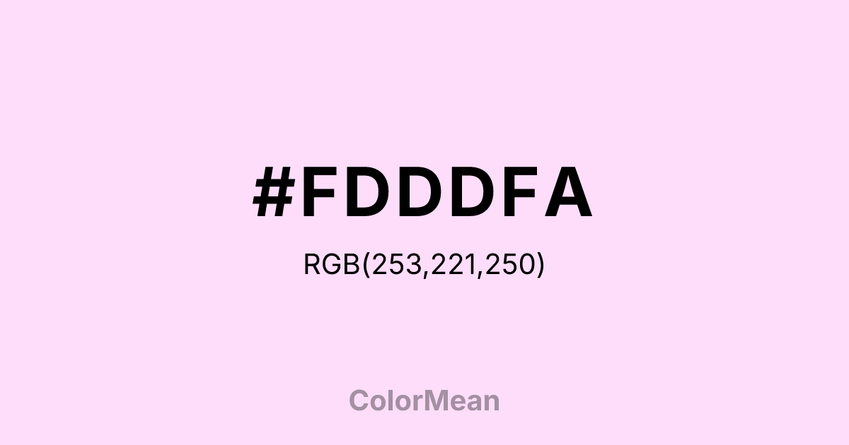 #FDDDFA RGB value is (253, 221, 250). The hex color red value is 253, green is 221, and blue is 250. Its HSL format shows a hue of 306°, saturation of 89 percent, and lightness of 93 percent. The CMYK process values are 0 percent, 13 percent, 1 percent, 1 percent.