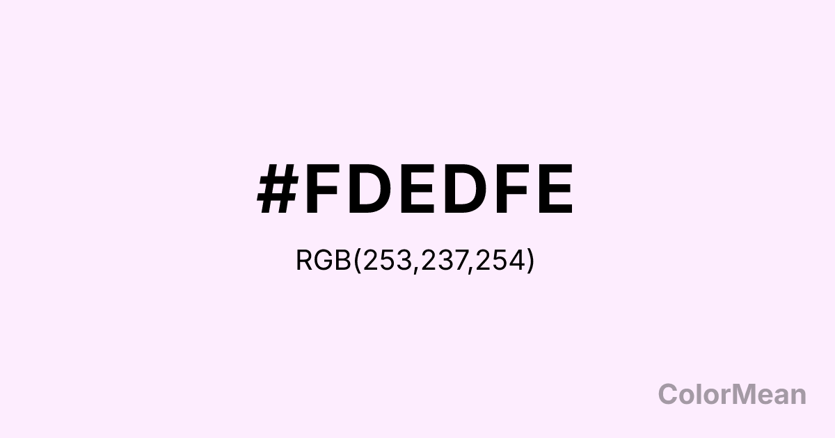 #FDEDFE RGB value is (253, 237, 254). The hex color red value is 253, green is 237, and blue is 254. Its HSL format shows a hue of 296°, saturation of 89 percent, and lightness of 96 percent. The CMYK process values are 0 percent, 7 percent, 0 percent, 0 percent.