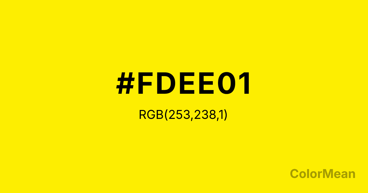#FDEE01 RGB value is (253, 238, 1). The hex color red value is 253, green is 238, and blue is 1. Its HSL format shows a hue of 56°, saturation of 99 percent, and lightness of 50 percent. The CMYK process values are 0 percent, 6 percent, 100 percent, 1 percent.