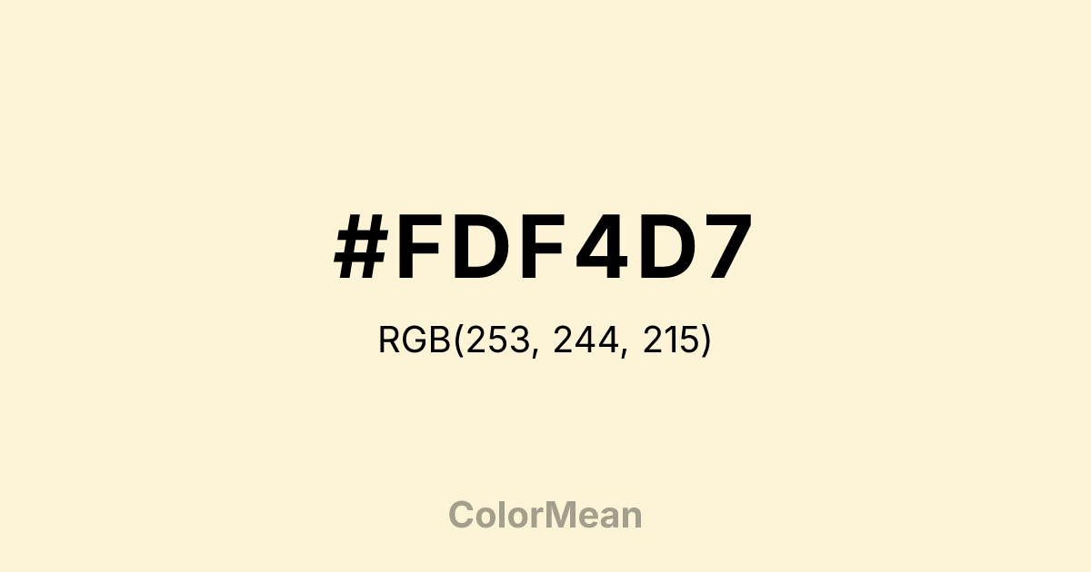 #FDF4D7 RGB value is (253, 244, 215). The hex color red value is 253, green is 244, and blue is 215. Its HSL format shows a hue of 46°, saturation of 90 percent, and lightness of 92 percent. The CMYK process values are 0 percent, 4 percent, 15 percent, 1 percent.