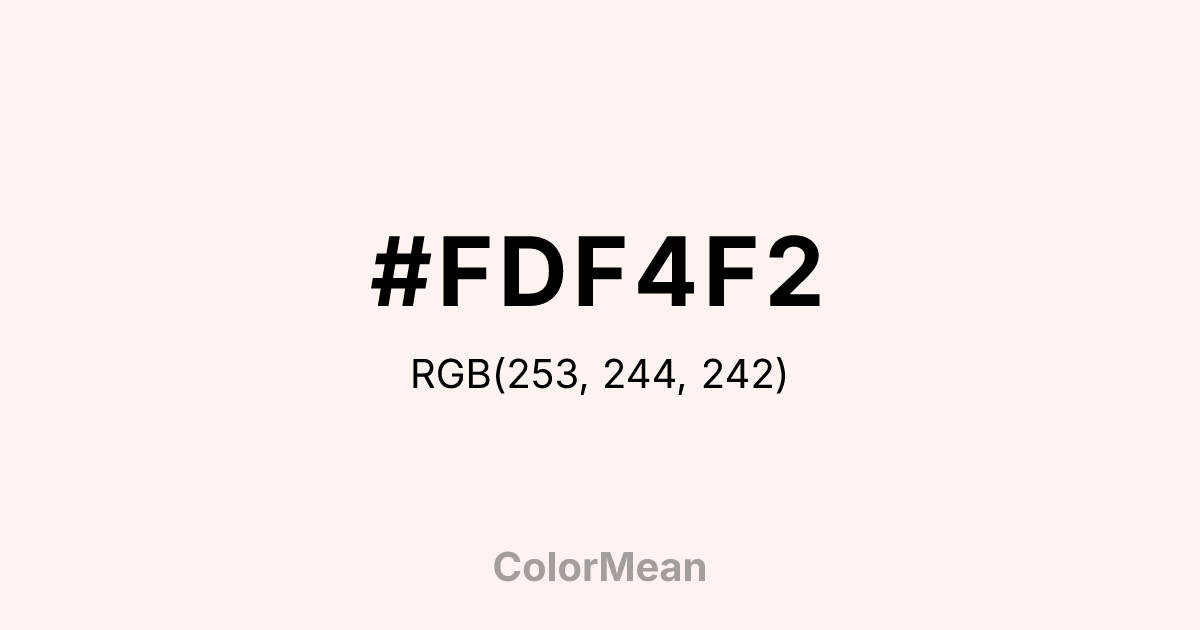 #FDF4F2 RGB value is (253, 244, 242). The hex color red value is 253, green is 244, and blue is 242. Its HSL format shows a hue of 11°, saturation of 73 percent, and lightness of 97 percent. The CMYK process values are 0 percent, 4 percent, 4 percent, 1 percent.