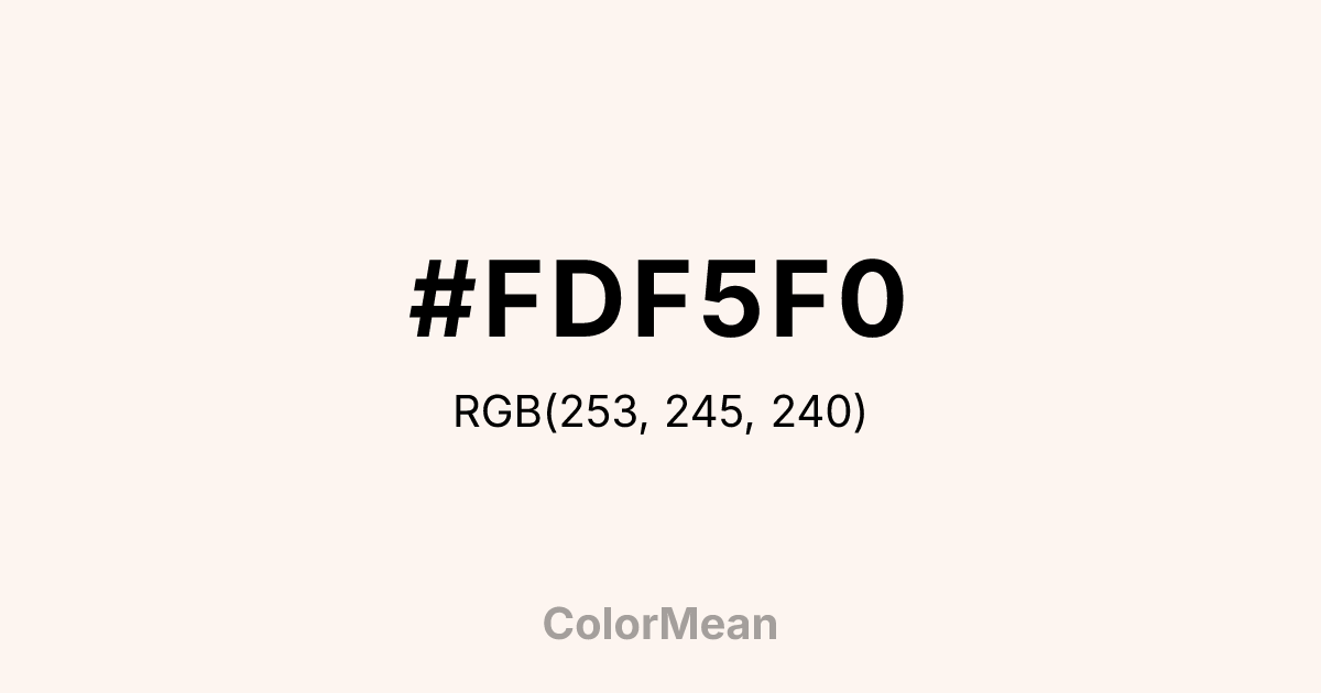 #FDF5F0 RGB value is (253, 245, 240). The hex color red value is 253, green is 245, and blue is 240. Its HSL format shows a hue of 23°, saturation of 76 percent, and lightness of 97 percent. The CMYK process values are 0 percent, 3 percent, 5 percent, 1 percent.
