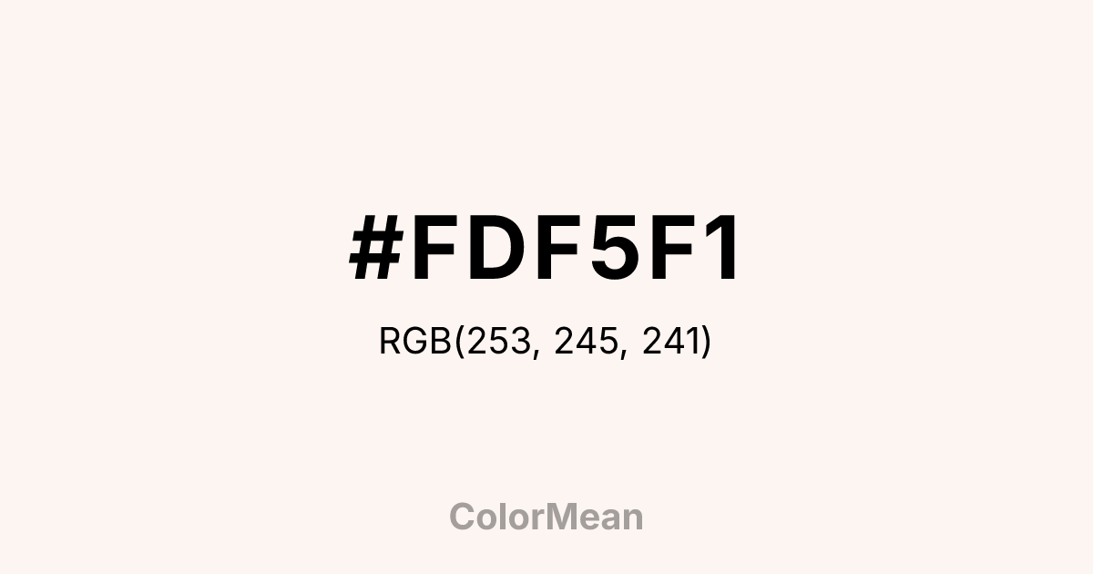 #FDF5F1 RGB value is (253, 245, 241). The hex color red value is 253, green is 245, and blue is 241. Its HSL format shows a hue of 20°, saturation of 75 percent, and lightness of 97 percent. The CMYK process values are 0 percent, 3 percent, 5 percent, 1 percent.