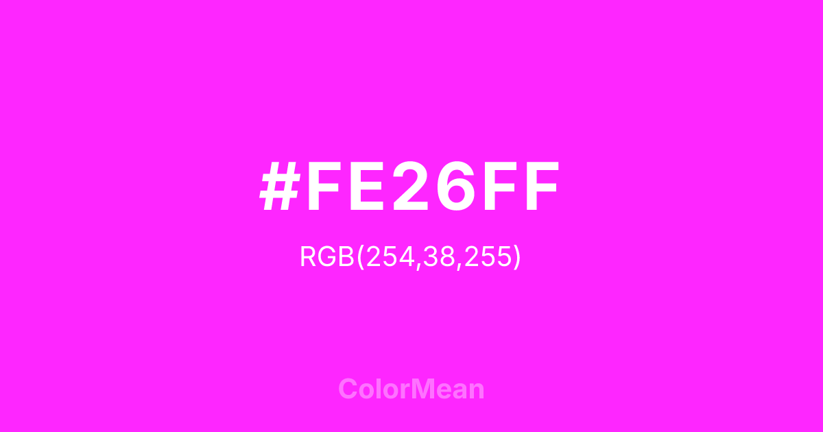 #FE26FF RGB value is (254, 38, 255). The hex color red value is 254, green is 38, and blue is 255. Its HSL format shows a hue of 300°, saturation of 100 percent, and lightness of 57 percent. The CMYK process values are 0 percent, 85 percent, 0 percent, 0 percent.