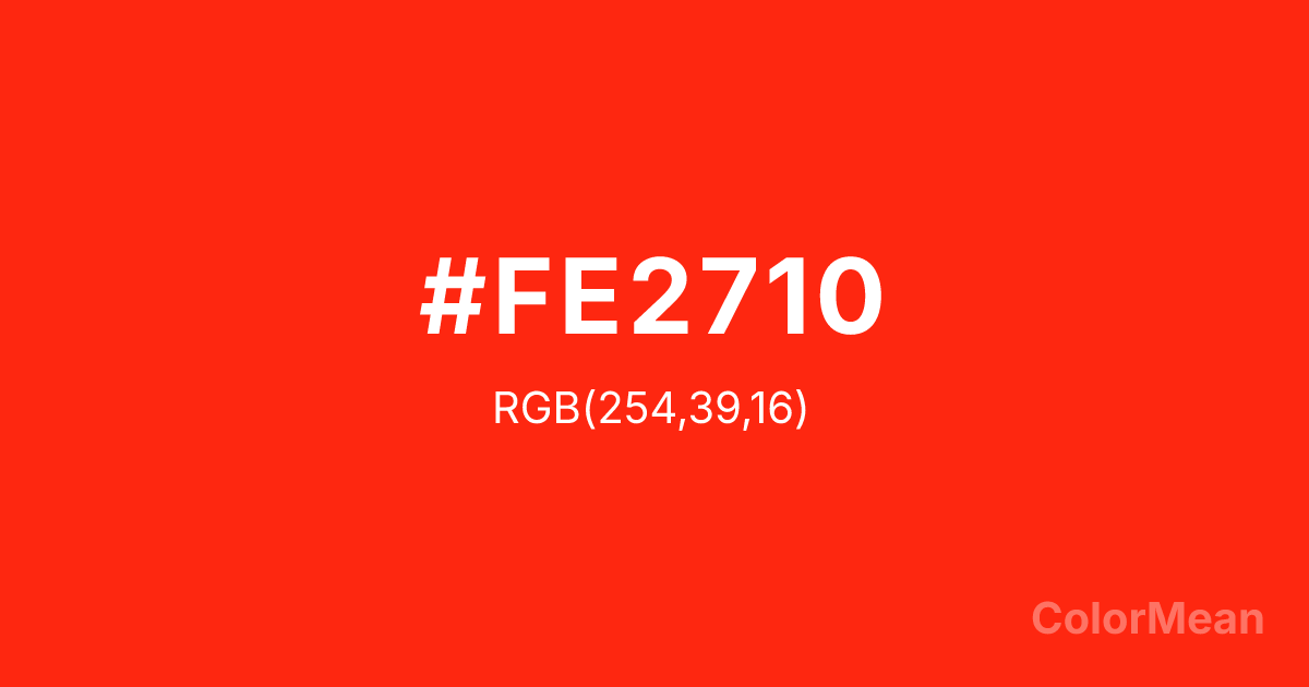 #FE2710 RGB value is (254, 39, 16). The hex color red value is 254, green is 39, and blue is 16. Its HSL format shows a hue of 6°, saturation of 99 percent, and lightness of 53 percent. The CMYK process values are 0 percent, 85 percent, 94 percent, 0 percent.