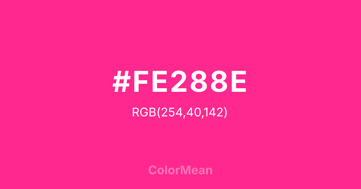 #FE288E RGB value is (254, 40, 142). The hex color red value is 254, green is 40, and blue is 142. Its HSL format shows a hue of 331°, saturation of 99 percent, and lightness of 58 percent. The CMYK process values are 0 percent, 84 percent, 44 percent, 0 percent.