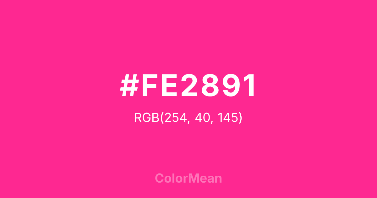 #FE2891 RGB value is (254, 40, 145). The hex color red value is 254, green is 40, and blue is 145. Its HSL format shows a hue of 331°, saturation of 99 percent, and lightness of 58 percent. The CMYK process values are 0 percent, 84 percent, 43 percent, 0 percent.
