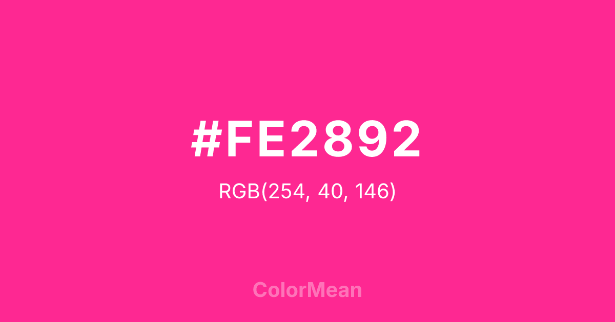 #FE2892 RGB value is (254, 40, 146). The hex color red value is 254, green is 40, and blue is 146. Its HSL format shows a hue of 330°, saturation of 99 percent, and lightness of 58 percent. The CMYK process values are 0 percent, 84 percent, 43 percent, 0 percent.
