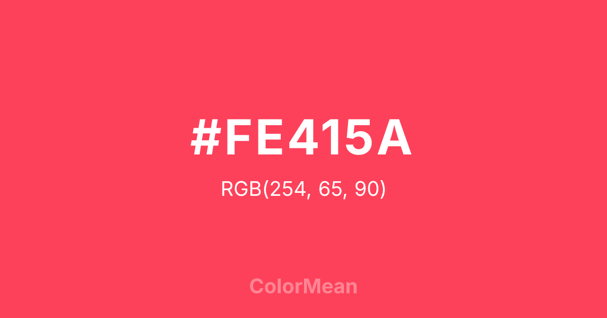 #FE415A RGB value is (254, 65, 90). The hex color red value is 254, green is 65, and blue is 90. Its HSL format shows a hue of 352°, saturation of 99 percent, and lightness of 63 percent. The CMYK process values are 0 percent, 74 percent, 65 percent, 0 percent.