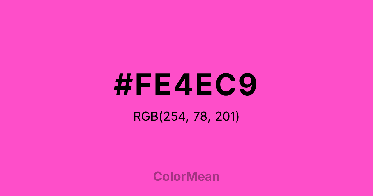 #FE4EC9 RGB value is (254, 78, 201). The hex color red value is 254, green is 78, and blue is 201. Its HSL format shows a hue of 318°, saturation of 99 percent, and lightness of 65 percent. The CMYK process values are 0 percent, 69 percent, 21 percent, 0 percent.
