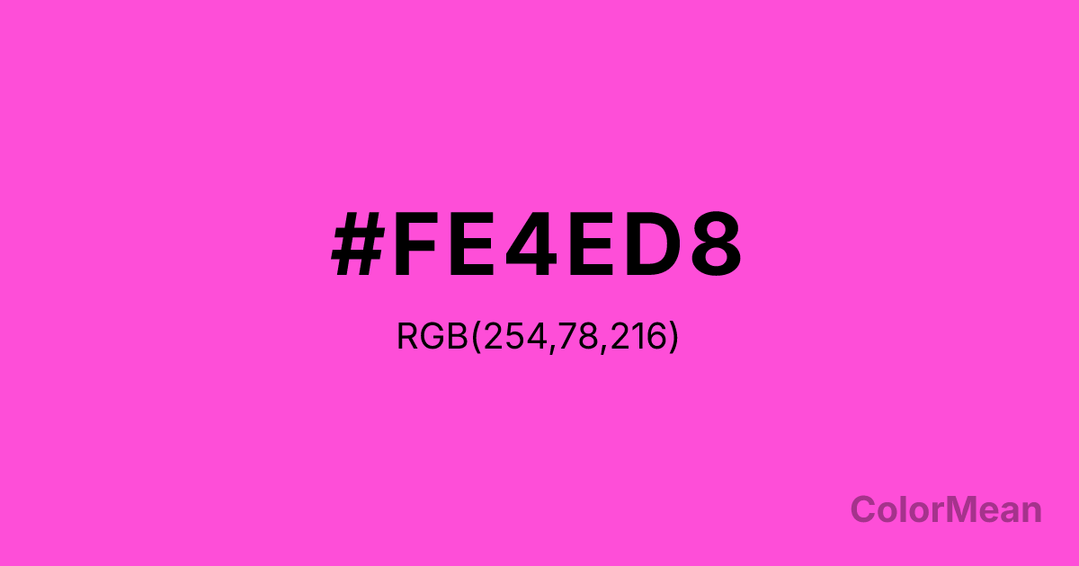 #FE4ED8 RGB value is (254, 78, 216). The hex color red value is 254, green is 78, and blue is 216. Its HSL format shows a hue of 313°, saturation of 99 percent, and lightness of 65 percent. The CMYK process values are 0 percent, 69 percent, 15 percent, 0 percent.