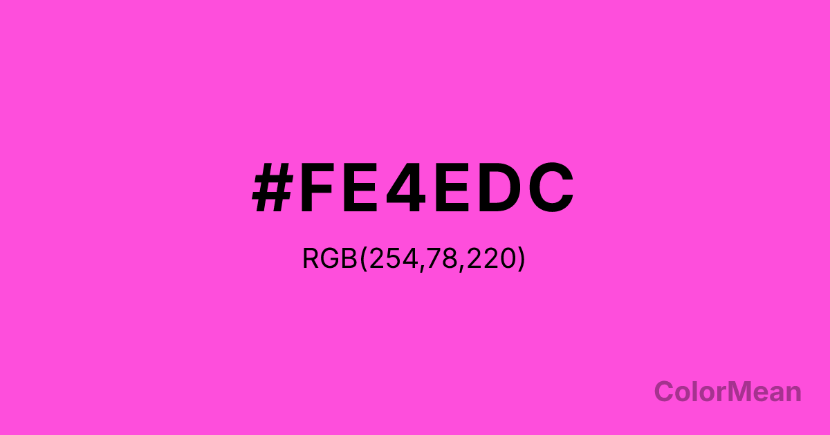 #FE4EDC RGB value is (254, 78, 220). The hex color red value is 254, green is 78, and blue is 220. Its HSL format shows a hue of 312°, saturation of 99 percent, and lightness of 65 percent. The CMYK process values are 0 percent, 69 percent, 13 percent, 0 percent.