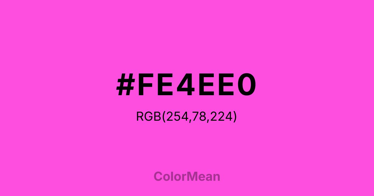 #FE4EE0 RGB value is (254, 78, 224). The hex color red value is 254, green is 78, and blue is 224. Its HSL format shows a hue of 310°, saturation of 99 percent, and lightness of 65 percent. The CMYK process values are 0 percent, 69 percent, 12 percent, 0 percent.