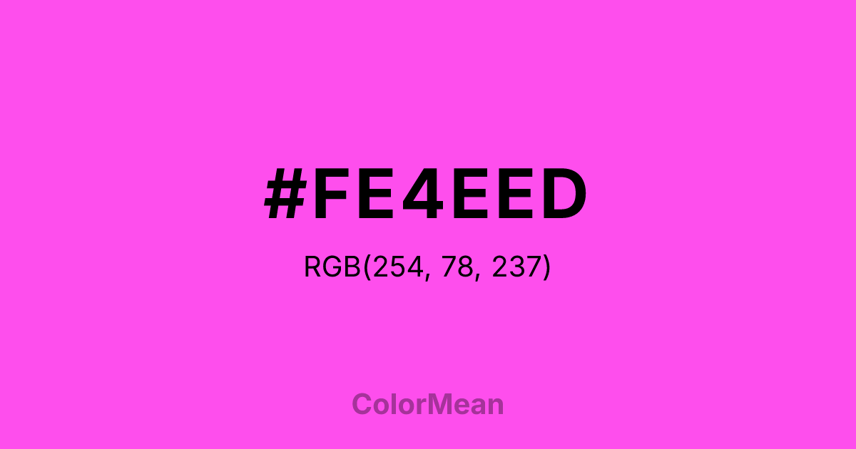 #FE4EED RGB value is (254, 78, 237). The hex color red value is 254, green is 78, and blue is 237. Its HSL format shows a hue of 306°, saturation of 99 percent, and lightness of 65 percent. The CMYK process values are 0 percent, 69 percent, 7 percent, 0 percent.