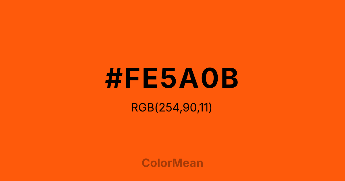 #FE5A0B RGB value is (254, 90, 11). The hex color red value is 254, green is 90, and blue is 11. Its HSL format shows a hue of 20°, saturation of 99 percent, and lightness of 52 percent. The CMYK process values are 0 percent, 65 percent, 96 percent, 0 percent.