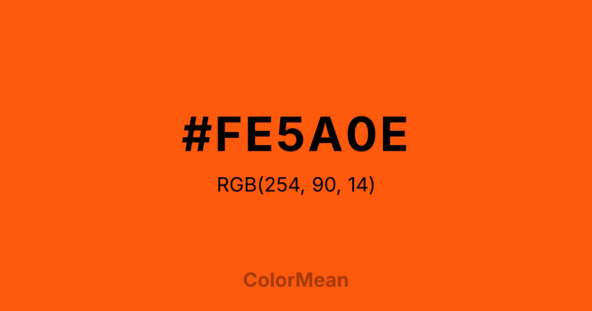 #FE5A0E RGB value is (254, 90, 14). The hex color red value is 254, green is 90, and blue is 14. Its HSL format shows a hue of 19°, saturation of 99 percent, and lightness of 53 percent. The CMYK process values are 0 percent, 65 percent, 94 percent, 0 percent.