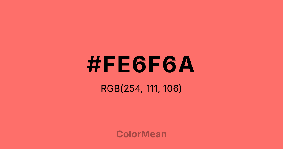 #FE6F6A RGB value is (254, 111, 106). The hex color red value is 254, green is 111, and blue is 106. Its HSL format shows a hue of 2°, saturation of 99 percent, and lightness of 71 percent. The CMYK process values are 0 percent, 56 percent, 58 percent, 0 percent.