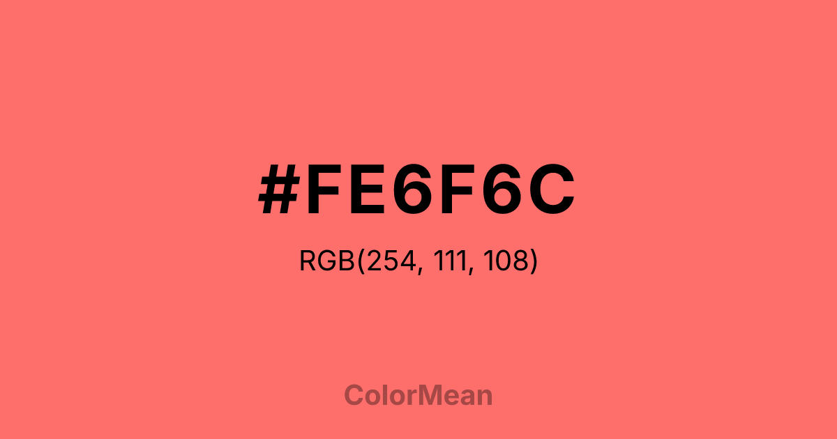 #FE6F6C RGB value is (254, 111, 108). The hex color red value is 254, green is 111, and blue is 108. Its HSL format shows a hue of 1°, saturation of 99 percent, and lightness of 71 percent. The CMYK process values are 0 percent, 56 percent, 57 percent, 0 percent.
