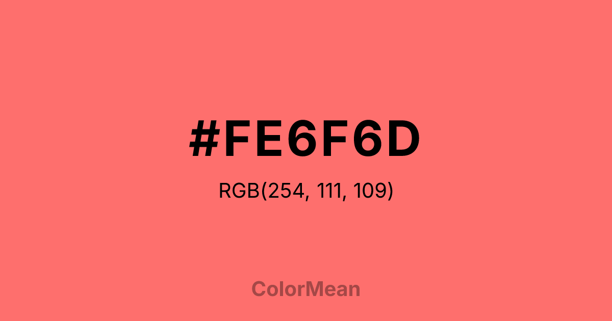 #FE6F6D RGB value is (254, 111, 109). The hex color red value is 254, green is 111, and blue is 109. Its HSL format shows a hue of 1°, saturation of 99 percent, and lightness of 71 percent. The CMYK process values are 0 percent, 56 percent, 57 percent, 0 percent.