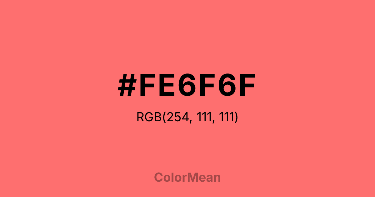 #FE6F6F RGB value is (254, 111, 111). The hex color red value is 254, green is 111, and blue is 111. Its HSL format shows a hue of 0°, saturation of 99 percent, and lightness of 72 percent. The CMYK process values are 0 percent, 56 percent, 56 percent, 0 percent.
