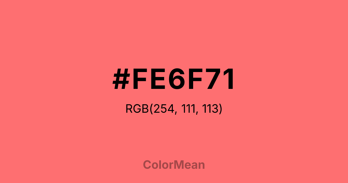 #FE6F71 RGB value is (254, 111, 113). The hex color red value is 254, green is 111, and blue is 113. Its HSL format shows a hue of 359°, saturation of 99 percent, and lightness of 72 percent. The CMYK process values are 0 percent, 56 percent, 56 percent, 0 percent.