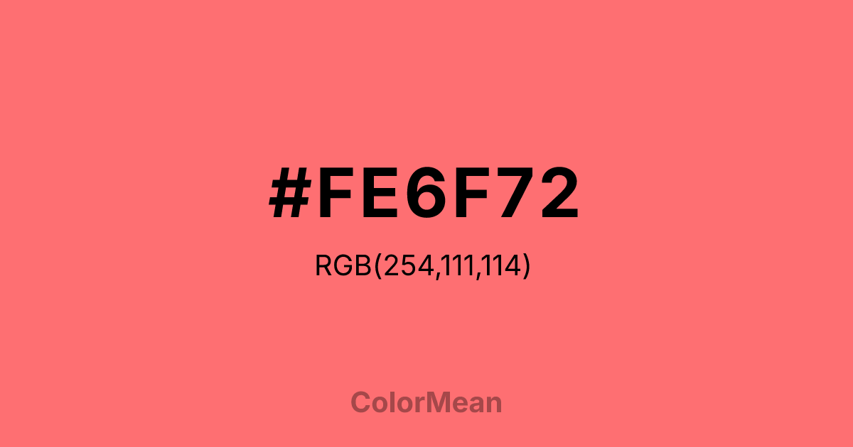 #FE6F72 RGB value is (254, 111, 114). The hex color red value is 254, green is 111, and blue is 114. Its HSL format shows a hue of 359°, saturation of 99 percent, and lightness of 72 percent. The CMYK process values are 0 percent, 56 percent, 55 percent, 0 percent.