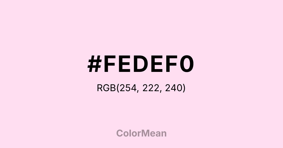 #FEDEF0 RGB value is (254, 222, 240). The hex color red value is 254, green is 222, and blue is 240. Its HSL format shows a hue of 326°, saturation of 94 percent, and lightness of 93 percent. The CMYK process values are 0 percent, 13 percent, 6 percent, 0 percent.