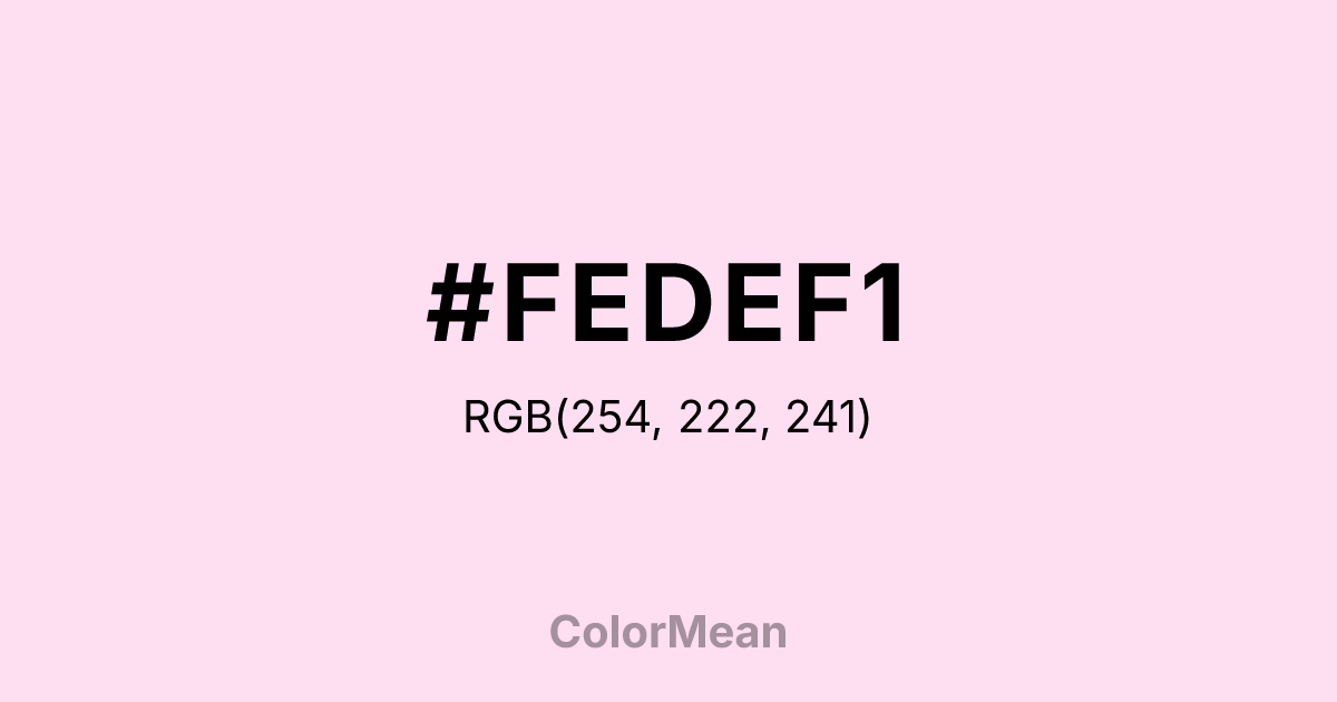 #FEDEF1 RGB value is (254, 222, 241). The hex color red value is 254, green is 222, and blue is 241. Its HSL format shows a hue of 324°, saturation of 94 percent, and lightness of 93 percent. The CMYK process values are 0 percent, 13 percent, 5 percent, 0 percent.