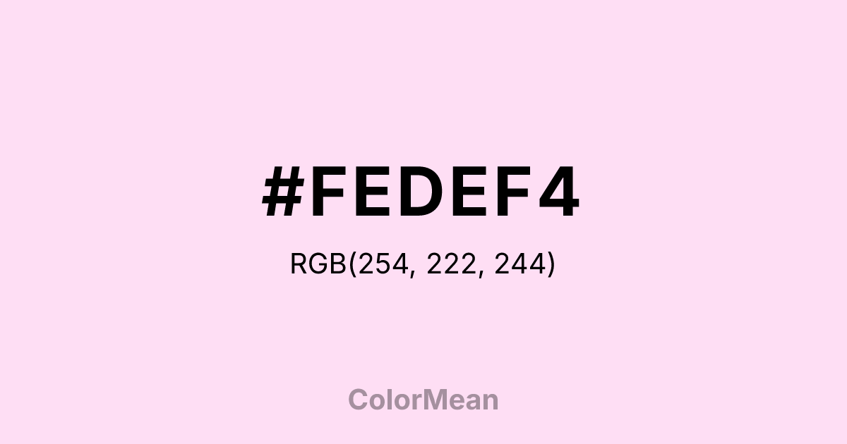 #FEDEF4 RGB value is (254, 222, 244). The hex color red value is 254, green is 222, and blue is 244. Its HSL format shows a hue of 319°, saturation of 94 percent, and lightness of 93 percent. The CMYK process values are 0 percent, 13 percent, 4 percent, 0 percent.