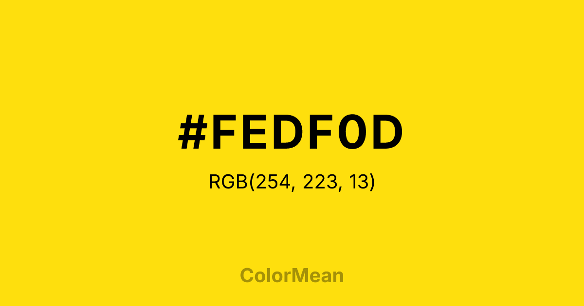#FEDF0D RGB value is (254, 223, 13). The hex color red value is 254, green is 223, and blue is 13. Its HSL format shows a hue of 52°, saturation of 99 percent, and lightness of 52 percent. The CMYK process values are 0 percent, 12 percent, 95 percent, 0 percent.