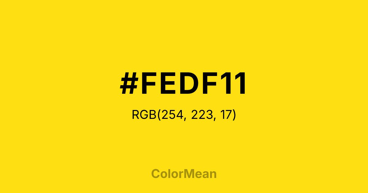 #FEDF11 RGB value is (254, 223, 17). The hex color red value is 254, green is 223, and blue is 17. Its HSL format shows a hue of 52°, saturation of 99 percent, and lightness of 53 percent. The CMYK process values are 0 percent, 12 percent, 93 percent, 0 percent.