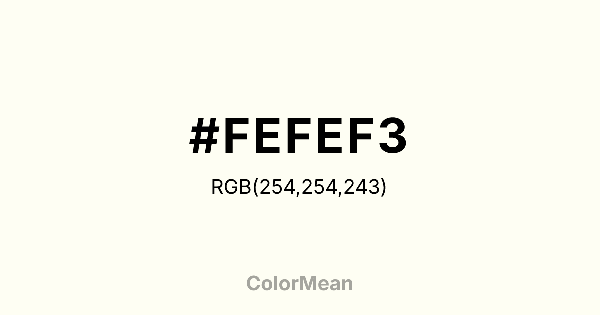 #FEFEF3 RGB value is (254, 254, 243). The hex color red value is 254, green is 254, and blue is 243. Its HSL format shows a hue of 60°, saturation of 85 percent, and lightness of 97 percent. The CMYK process values are 0 percent, 0 percent, 4 percent, 0 percent.