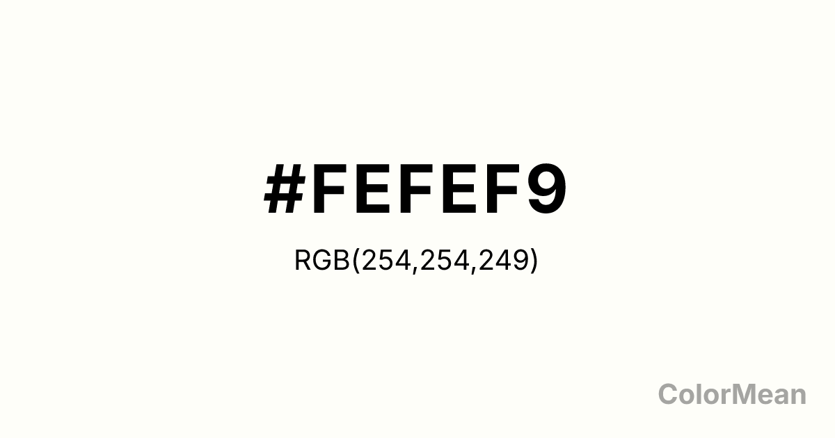 #FEFEF9 RGB value is (254, 254, 249). The hex color red value is 254, green is 254, and blue is 249. Its HSL format shows a hue of 60°, saturation of 71 percent, and lightness of 99 percent. The CMYK process values are 0 percent, 0 percent, 2 percent, 0 percent.