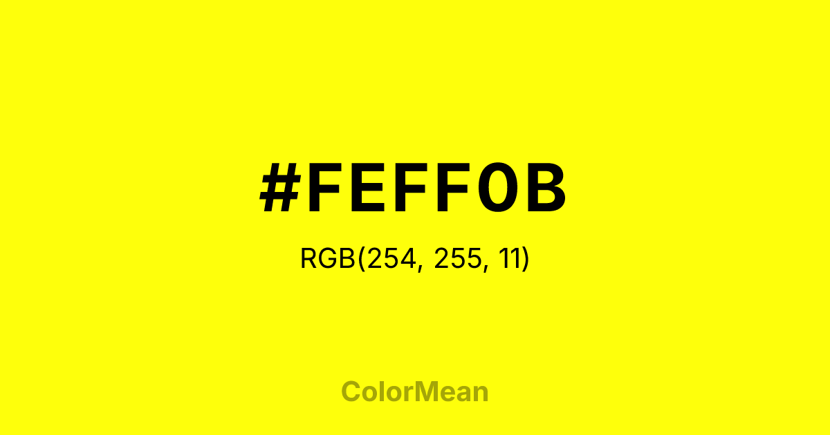 #FEFF0B RGB value is (254, 255, 11). The hex color red value is 254, green is 255, and blue is 11. Its HSL format shows a hue of 60°, saturation of 100 percent, and lightness of 52 percent. The CMYK process values are 0 percent, 0 percent, 96 percent, 0 percent.