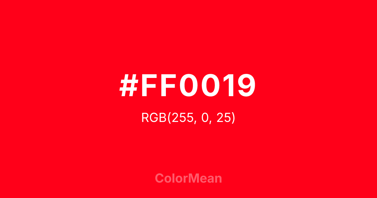 #FF0019 RGB value is (255, 0, 25). The hex color red value is 255, green is 0, and blue is 25. Its HSL format shows a hue of 354°, saturation of 100 percent, and lightness of 50 percent. The CMYK process values are 0 percent, 100 percent, 90 percent, 0 percent.