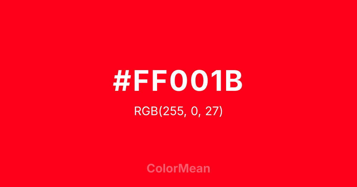 #FF001B RGB value is (255, 0, 27). The hex color red value is 255, green is 0, and blue is 27. Its HSL format shows a hue of 354°, saturation of 100 percent, and lightness of 50 percent. The CMYK process values are 0 percent, 100 percent, 89 percent, 0 percent.