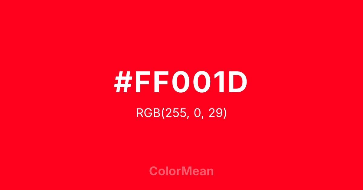 #FF001D RGB value is (255, 0, 29). The hex color red value is 255, green is 0, and blue is 29. Its HSL format shows a hue of 353°, saturation of 100 percent, and lightness of 50 percent. The CMYK process values are 0 percent, 100 percent, 89 percent, 0 percent.